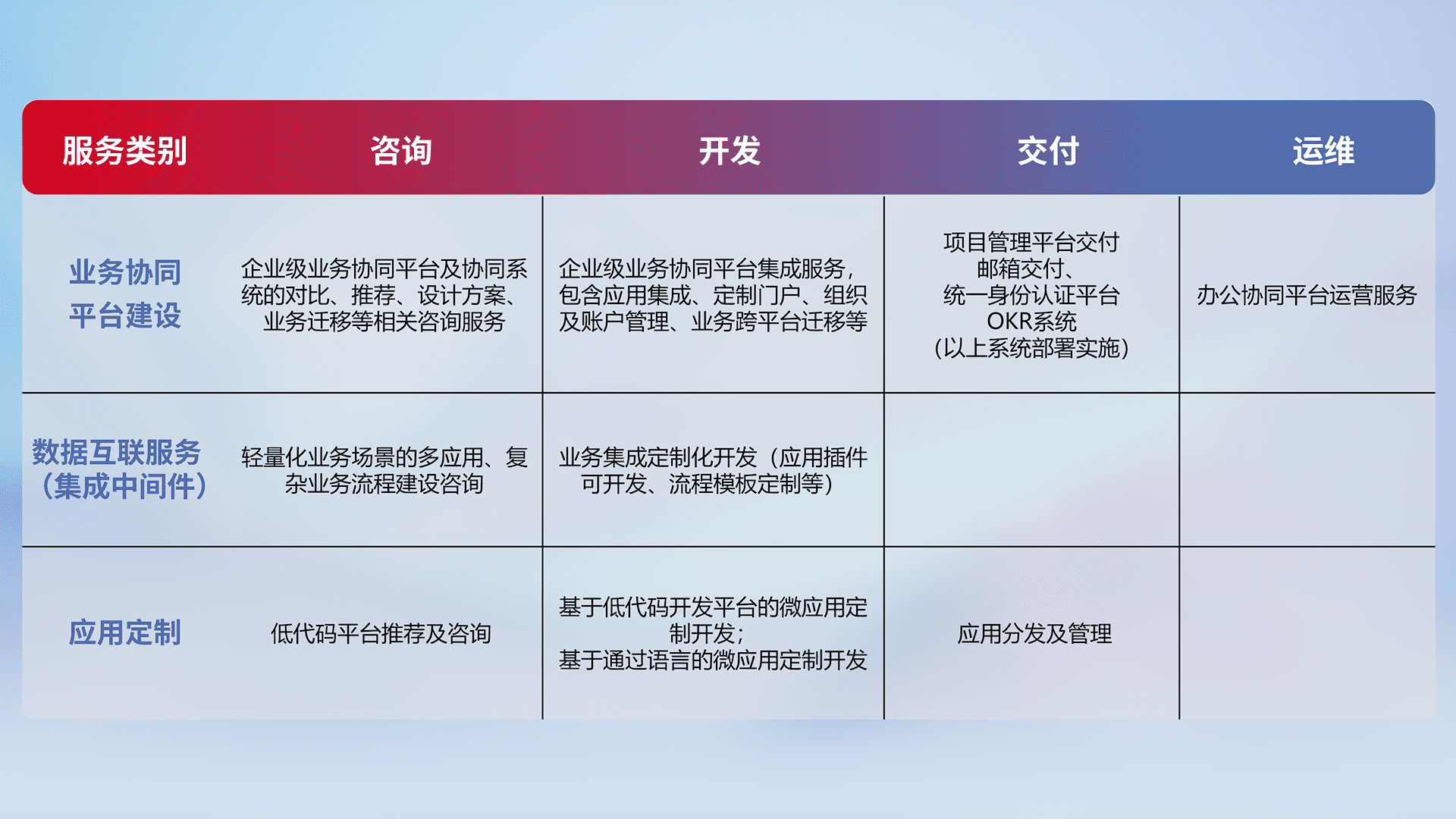 针对钉钉、、企微、、IDaas等平台级产品提供产品的规划、、、方案、、交付、、定制化开发等服务,,实现如统一协同办公、、、、智能客户服务、、、、混合会议管理、、智能数据查询、、、等业务场景,,实现数字化转型。。。